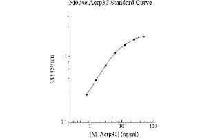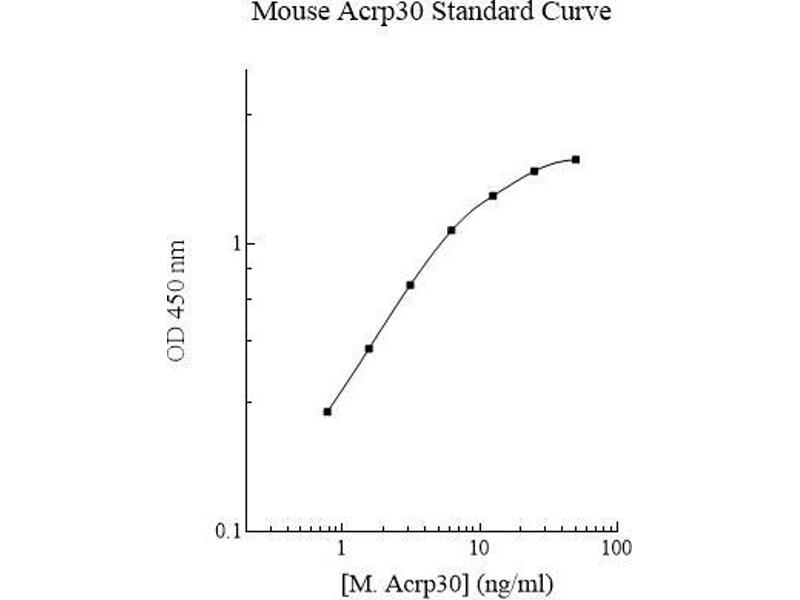 - Adiponectin Microplate: A 96-well polystyrene microplate (12 strips of 8 wells) coated with a polyclonal antibody against mouse adiponectin. Sealing Tapes: Each kit contains 3 pre-cut, pressure-sensitive sealing tapes, which can be cut to fit the format of the individual assay. Adiponectin Standard: Mouse adiponectin in a buffered protein base (100 ng, lyophilized). 1 Biotinylated Adiponectin Antibody (50x): A 50-fold concentrated biotinylated polyclonal antibody against adiponectin (140µl). MIx Diluent Concentrate (10x): A 10-fold concentrated buffered protein base (30 ml). Wash Buffer Concentrate (20x): A 20-fold concentrated buffered surfactant (30 ml, 2 bottles). Streptavidin-Peroxidase Conjugate (SP Conjugate): A 100-fold concentrate (80µl). Chromogen Substrate: A ready-to-use stabilized peroxidase chromogen substrate tetramethylbenzidine (8 ml). Stop Solution: A 0.5 N hydrochloric acid to stop the chromogen substrate reaction (12 ml).
