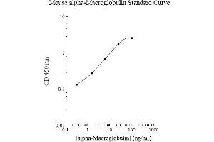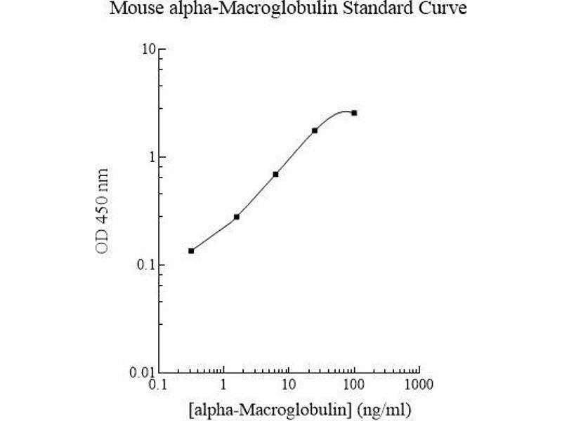 Prepare all reagents, standard solutions, and samples as instructed. Bring all reagents to room temperature before use. The assay is performed at room temperature (20-25 °C). Remove excess microplate strips from the plate frame and return them immediately to the foil pouch with desiccants inside. Reseal the pouch 5 securely to minimize exposure to water vapor and store in a vacuum desiccator. Add 50 l of Mouse alpha-2-Macroglobulin Standard or sample per well. Gently tap plate to thoroughly coat the wells. Break any bubbles that may have formed. Cover wells with a sealing tape and incubate for 2 hours. Start the timer after the last addition. Wash five times with 200 l of Wash Buffer manually. Invert the plate each time and decant the contents, hit 4-5 times on absorbent material to completely remove the liquid. If using a machine, wash six times with 300 l of Wash Buffer and then invert the plate, decanting the contents, hit 4-5 times on absorbent material to completely remove the liquid. Add 50 l of Biotinylated Mouse alpha-2-Macroglobulin Antibody to each well. Gently tap plate to thoroughly coat the wells. Break any bubbles that may have formed. Cover wells with a sealing tape and incubate for 1 hour. Wash the microplate as described above. Add 50 l of Streptavidin-Peroxidase Conjugate per well. Gently tap plate to thoroughly coat the wells. Break any bubbles that may have formed. Cover wells with a sealing tape and incubate for 30 minutes. Turn on the microplate reader and set up the program in advance. Wash the microplate as described above. Add 50 l of Chromogen Substrate per well. Gently tap plate to thoroughly coat the wells. Break any bubbles that may have formed. Incubate for 25 minutes or till the optimal blue color density develops. Add 50 l of Stop Solution to each well. The color will change from blue to yellow. Gently tap plate to ensure thorough mixing. Break any bubbles that may have formed. Read the absorbance on a microplate reader at a wavelength of 450 nm immediately. If wavelength correction is available, subtract readings at 570 nm from those at 450 nm to correct optical imperfections. Otherwise, read the plate at 450 nm only. Please note that some unstable black particles may be generated at high concentration points after stopping the reaction for about 10 minutes, which will reduce the readings.