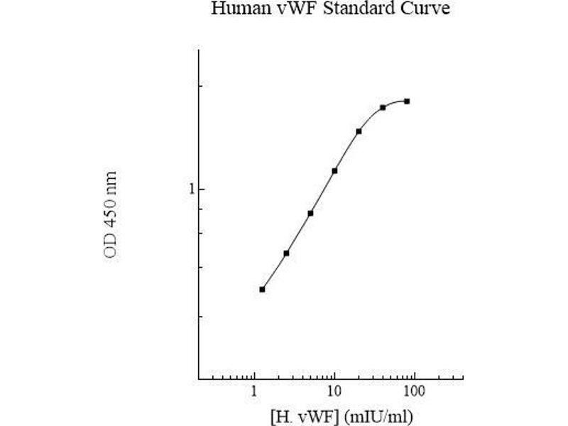 Prepare all reagents, working standards and samples as instructed. Bring all reagents to room temperature before use. The assay is performed at room temperature (20 - 30 °C). Remove excess microplate strips from the plate frame and return them immediately to the foil pouch with desiccant inside. Reseal the pouch securely to minimize exposure to water vapor and store in a vacuum desiccator. Add 50 µL of standard or sample per well, and cover wells and incubate for two hours. Start the timer after the last sample addition. Wash five times with 200 µL of Wash Buffer manually. Invert the plate each time and decant the contents, hit it 4-5 times on absorbent paper towel to completely remove the liquid. If using a machine wash six times with 300 µL of Wash Buffer and then invert the plate, decant the contents, hit it 4-5 times on absorbent paper towel to completely remove the liquid. Add 50 µL of Biotinylated VWF Antibody to each well and incubate for two hours. Wash a microplate as described above. Add 50 µL of Streptavidin-Peroxidase Conjugate to each well and incubate for 30 minutes. Turn on the microplate reader and set up the program in advance. Wash a microplate as described above. Add 50 µL of Chromogen Substrate per well and incubate for about 15 minutes or until the optimal blue color density develops. Gently tap plate to ensure thorough mixing and break the bubbles in the well with pipette tip. Add 50 µL of Stop Solution to each well. The color will change from blue to yellow. 3 Read the absorbance on a microplate reader at a wavelength of 450 nm immediately. If wavelength correction is available, subtract readings at 570 nm from those at 450 nm to correct optical imperfections. Otherwise, read the plate at 450 nm only. Please note that some unstable black particles may be generated at high concentration points after stopping the reaction for about 10 minutes, which will reduce the readings.