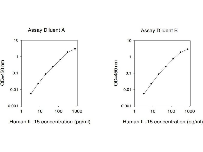 - Bring all reagents and samples to room temperature (18 - 25°C) before use. 2. Sample dilution: If your samples need to be diluted, Assay Diluent A (Item D) is used for dilution of serum/plasma samples, and Assay Diluent B (Item E) is used for dilution of culture supernatants and urine. 3. Assay Diluent B should be diluted 5-fold with deionized or distilled water. 4. Preparation of standard: Briefly spin the vial of Item C. Add 400 µl Assay Diluent A (for serum/plasma samples) or 1x Assay Diluent B (for cell culture medium and urine) into Item C vial to prepare a 50 ng/ml standard. Dissolve the powder thoroughly by a gentle mix. Add 12 µl IL-15 standard from the vial of Item C, into a tube with 738 µl Assay Diluent A or 1x Assay Diluent B to prepare a 800 pg/ml stock standard solution. Pipette 300 µl Assay Diluent A or 1x Assay Diluent B into each tube. Use the stock standard solution to produce a dilution series (shown below). Mix each tube thoroughly before the next transfer. Assay Diluent A or 1x Assay Diluent B serves as the zero standard (0 pg/ml). 5. If the Wash Concentrate (20x) (Item B) contains visible crystals, warm to room temperature and mix gently until dissolved. Dilute 20 ml of Wash Buffer Concentrate into deionized or distilled water to yield 400 ml of 1x Wash Buffer. 6. Briefly spin the Detection Antibody vial (Item F) before use. Add 100 µl of 1x Assay Diluent B into the vial to prepare a detection antibody concentrate. Pipette up and down to mix gently (the concentrate can be stored at 4°C for 5 days). The detection antibody concentrate should be diluted 80-fold with 1x Assay Diluent B and used in step 4 of Part VI Assay Procedure. 7. Briefly spin the HRP-Streptavidin concentrate vial (Item G) and pipette up and down to mix gently before use. HRP-Streptavidin concentrate should be diluted 10,000-fold with 1x Assay Diluent B. For example: Briefly spin the vial (Item G) and pipette up and down to mix gently . Add 2 µl of HRP-Streptavidin concentrate into a tube with 198.0 µl 1x Assay Diluent B to prepare a 100-fold diluted HRP-Streptavidin solution (do not store the diluted solution for next day use). Mix through and then pipette 120 µl of prepared 100-fold diluted solution into a tube with 12 ml 1x Assay Diluent B to prepare a final 10,000 fold diluted HRP-Streptavidin solution.