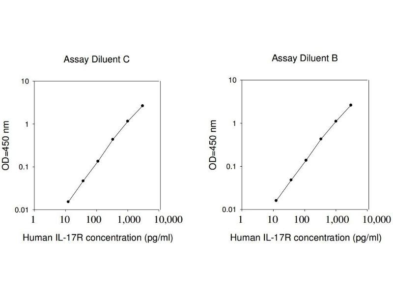 - Bring all reagents and samples to room temperature (18 - 25°C) before use. 2. Sample dilution: Assay Diluent C (Item L) is used for dilution of serum/plasma samples, 1x Assay Diluent B (Item E) can be used for dilution of cell culture supernates/urine. 3. Assay Diluent B should be diluted 5-fold with deionized or distilled water before use. 4. Preparation of standard: Briefly spin the vial of Item C and then add 400 µl Assay Diluent C (for serum/plasma samples) or 1x Assay Diluent B (for cell culture supernates/urine) into Item C vial to prepare a 50 ng/ml standard. Dissolve the powder thoroughly by a gentle mix. Add 30 µl IL-17R standard (50 ng/ml) from the vial of Item C, into a tube with 470 µl Assay Diluent C or 1x Assay Diluent B to prepare a 3,000 pg/ml standard solution. Pipette 400 µl Assay Diluent C or 1x Assay Diluent B into each tube. Use the 3,000 pg/ml standard solution to produce a dilution series (shown below). Mix each tube thoroughly before the next transfer. Gently vortex to mix. Assay Diluent C or 1x Assay Diluent B serves as the zero standard (0 pg/ml). 5. If the Wash Concentrate (20x) (Item B) contains visible crystals, warm to room temperature and mix gently until dissolved. Dilute 20 ml of Wash Buffer Concentrate into deionized or distilled water to yield 400 ml of 1x Wash Buffer. 6. Briefly spin the Detection Antibody vial (Item F) before use. Add 100 µl of 1x Assay Diluent B into the vial to prepare a detection antibody concentrate. Pipette up and down to mix gently (the concentrate can be stored at 4°C for 5 days). The detection antibody concentrate should be diluted 80-fold with 1x Assay Diluent B and used in step 4 of Part VI Assay Procedure. 7. Briefly spin the HRP-Streptavidin concentrate vial (Item G) and pipette up and down to mix gently before use. HRP-Streptavidin concentrate should be diluted 10,000-fold with 1x Assay Diluent B. For example: Briefly spin the vial (Item G) and pipette up and down to mix gently . Add 2 µl of HRP-Streptavidin concentrate into a tube with 198 µl 1x Assay Diluent B to prepare a 100-fold diluted HRP- Streptavidin solution (do not store the diluted solution for next day use). Mix through and then pipette 100 µl of prepared 100-fold diluted solution into a tube with 10 ml 1x Assay Diluent B to prepare a final 10,000 fold diluted HRP-Streptavidin solution.
