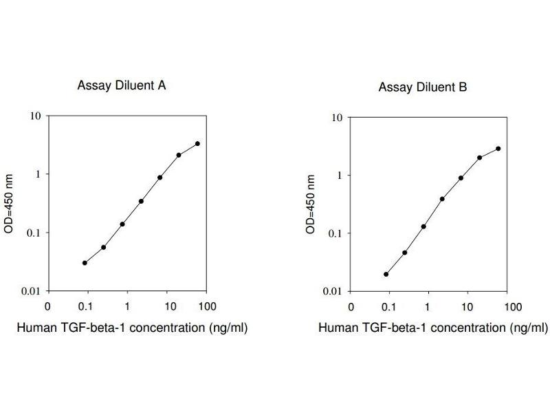 Typical Data: These standard curves are for demonstration only. A standard curve must be run with each assay. Assay Diluent A Human TGF-beta-1 concentration (ng/mL) O D =4 50 n m 0.01 0.1 1 10 0 0.1 1 10 100 Assay Diluent B Human TGF-beta-1 concentration (ng/mL) O D =4 50 n m 0.01 0.1 1 10 0 0.1 1 10 100