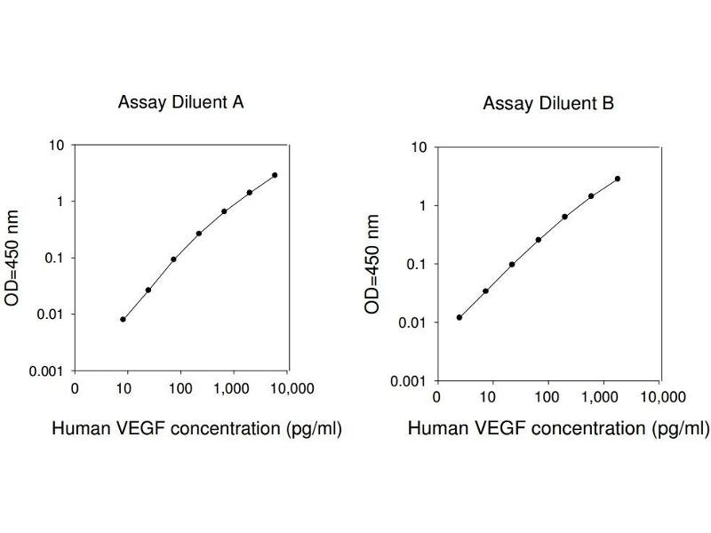 Typical Data: These standard curves are for demonstration only. A standard curve must be run with each assay. Assay Diluent A Human VEGF concentration (pg/mL) O D =4 50 n m 0.001 0.01 0.1 1 10 0 10 100 1,000 10,000 Assay Diluent B Human VEGF concentration (pg/mL) O D =4 50 n m 0.001 0.01 0.1 1 10 0 10 100 1,000 10,000