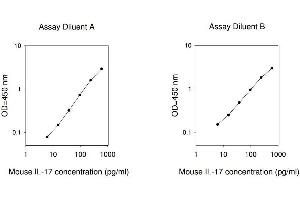 Typical Data: These standard curves are for demonstration only. A standard curve must be run with each assay. Assay Diluent A Mouse IL-17 concentration (pg/mL) 1 10 100 1000 O D =4 50 n m 0.1 1 10 Assay Diluent B Mouse IL-17 concentration (pg/mL) 1 10 100 1000 O D =4 50 n m 0.1 1 10