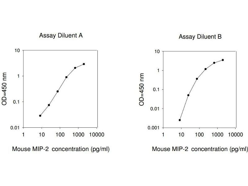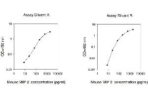 Typical Data: These standard curves are for demonstration only. A standard curve must be run with each assay. Assay Diluent A Mouse MIP-2 concentration (pg/mL) 1 10 100 1000 10000 O D =4 50 n m 0.01 0.1 1 10 Assay Diluent B Mouse MIP-2 concentration (pg/mL) 1 10 100 1000 10000 O D =4 50 n m 0.001 0.01 0.1 1 10