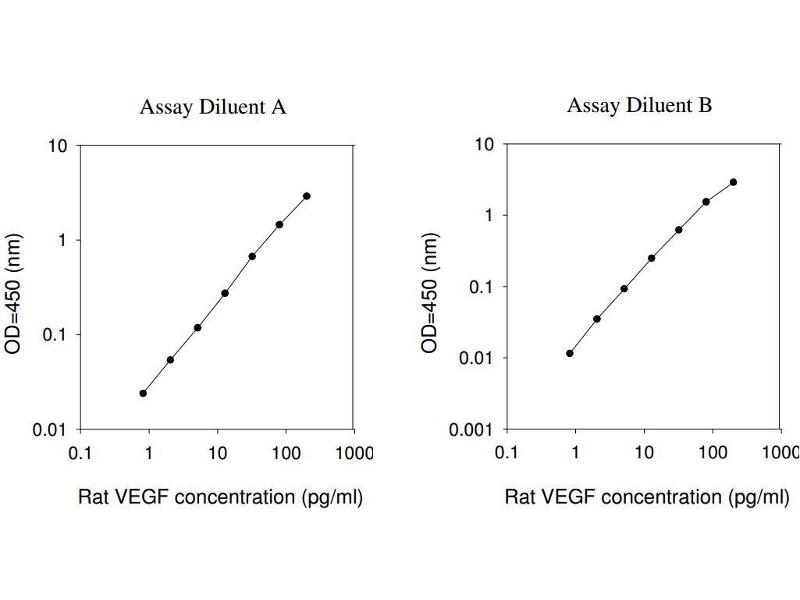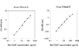 Typical Data: These standard curves are for demonstration only. A standard curve must be run with each assay. Assay Diluent A Rat VEGF concentration (pg/mL) 0.1 1 10 100 1000 O D =4 50 (n m ) 0.01 0.1 1 10 Assay Diluent B Rat VEGF concentration (pg/mL) 0.1 1 10 100 1000 O D =4 50 (n m ) 0.001 0.01 0.1 1 10