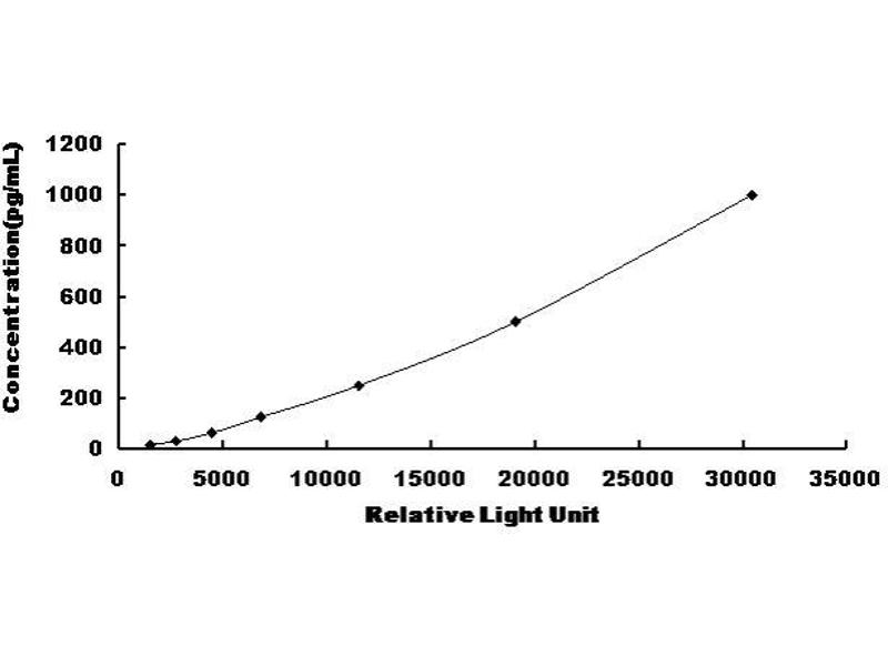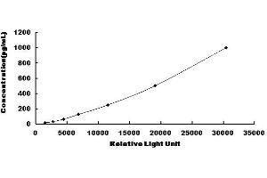 In order to make the calculation easier, we plot the RLU value of the standard (X-axis) against the known concentration of the standard (Y-axis), although concentration is indeed the independent variable while RLU value is the dependent variable. Further, in this part, in order to help the customer perform the assay more visual, we provide the customer with the raw data (not the log of data). However, plotting log of the data to construct the curve will be recommended. The RLU values of the standard curve may vary according to the conditions of assay performance (e.g. operator, pipetting technique, washing technique or temperature effects). This curve is provided for demonstration only. The customers should establish their own standard curve for each test conducted. -