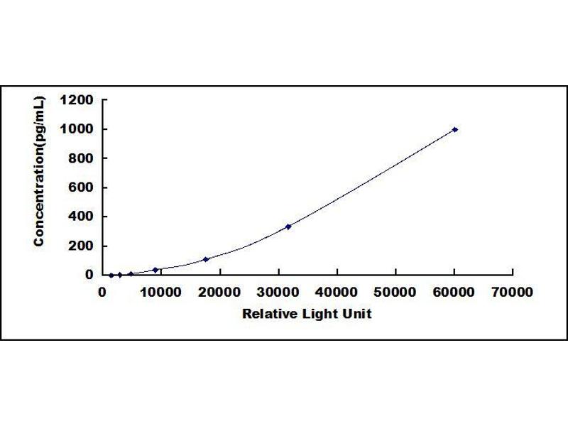 In order to make the calculation easier, we plot the RLU value of the standard (X-axis) against the known concentration of the standard (Y-axis), although concentration is indeed the independent variable while RLU value is the dependent variable. Further, in this part, in order to help the customer perform the assay more visual, we provide the customer with the raw data (not the log of data). However, plotting log of the data to construct the curve will be recommended. The RLU values of the standard curve may vary according to the conditions of assay performance (e.g. operator, pipetting technique, washing technique or temperature effects). This curve is provided for demonstration only. The customers should establish their own standard curve for each test conducted. -