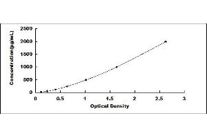 In order to make the calculation easier, we plot the O.D. value of the standard (X-axis) against the log of concentration of the standard (Y-axis), although concentration is the independent variable and O.D. value is the dependent variable. The O.D. values of the standard curve may vary according to the conditions of assay performance (e.g. operator, pipetting technique, washing technique or temperature effects). Typical standard curve below is provided for reference only. -
