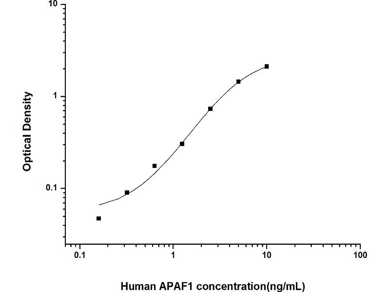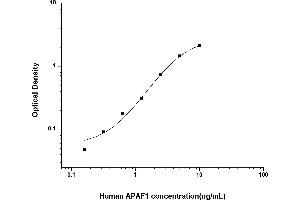 Intra-assay Precision (Precision within an assay): 3 samples with low, mid range and high level Human APAF1 were tested 20 times on one plate, respectively. Inter-assay Precision (Precision between assays): 3 samples with low, mid range and high level Human APAF1 were tested on 3 different plates, 20 replicates in each plate. Both intra-CV and inter-CV are < 10 %.