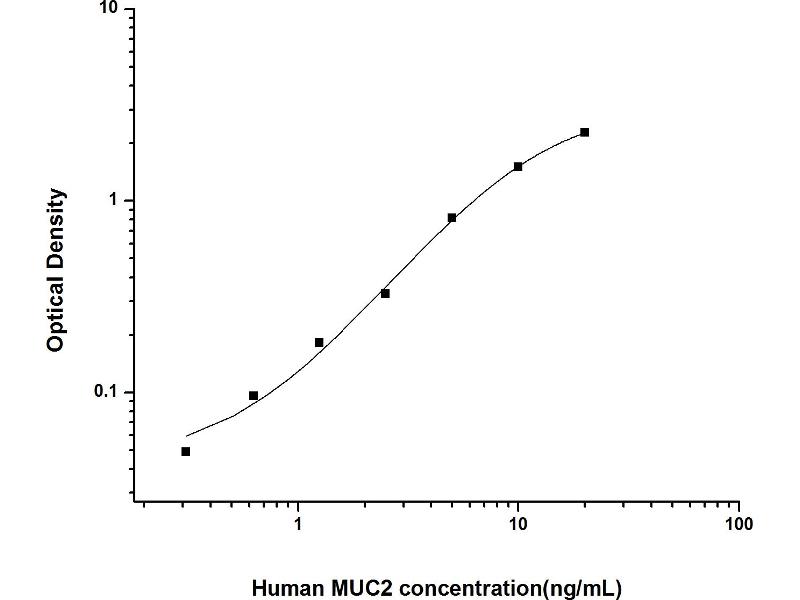 Intra-assay Precision (Precision within an assay): 3 samples with low, mid range and high level Human MUC2 were tested 20 times on one plate, respectively. Inter-assay Precision (Precision between assays): 3 samples with low, mid range and high level Human MUC2 were tested on 3 different plates, 20 replicates in each plate. Both intra-CV and inter-CV are < 10 %.