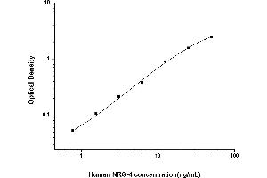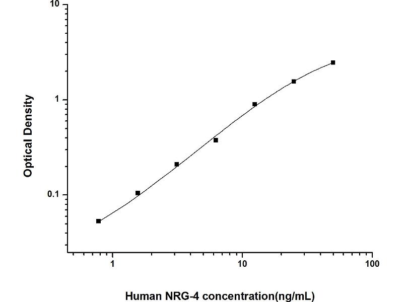 Intra-assay Precision (Precision within an assay): 3 samples with low, mid range and high level Human NRG-4 were tested 20 times on one plate, respectively. Inter-assay Precision (Precision between assays): 3 samples with low, mid range and high level Human NRG-4 were tested on 3 different plates, 20 replicates in each plate. Both intra-CV and inter-CV are < 10 %.
