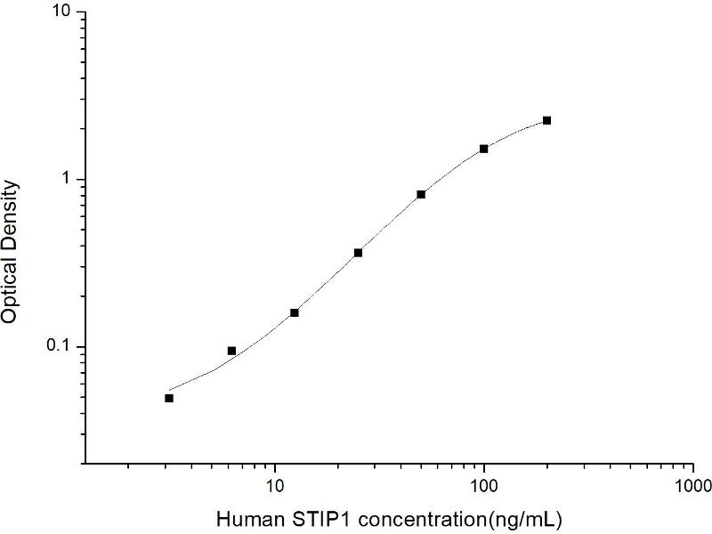 Intra-assay Precision (Precision within an assay): 3 samples with low, mid range and high level Human STIP1 were tested 20 times on one plate, respectively. Inter-assay Precision (Precision between assays): 3 samples with low, mid range and high level Human STIP1 were tested on 3 different plates, 20 replicates in each plate. Both intra-CV and inter-CV are < 10 %.
