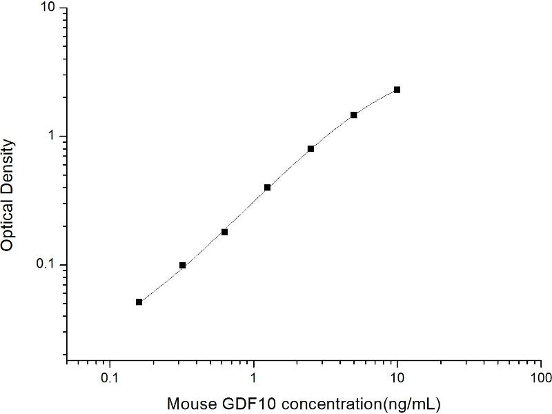 Intra-assay Precision (Precision within an assay): 3 samples with low, mid range and high level Mouse GDF10 were tested 20 times on one plate, respectively. Inter-assay Precision (Precision between assays): 3 samples with low, mid range and high level Mouse GDF10 were tested on 3 different plates, 20 replicates in each plate. Both intra-CV and inter-CV are < 10 %.