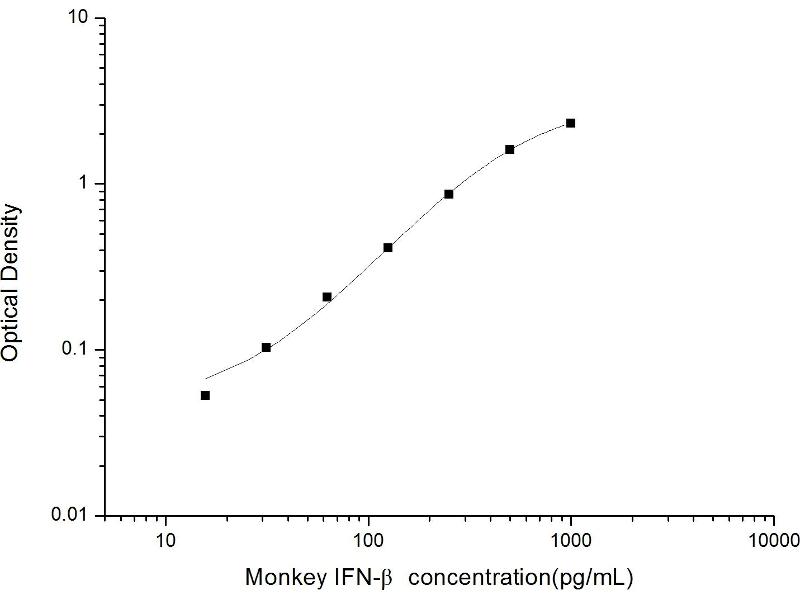 Intra-assay Precision (Precision within an assay): 3 samples with low, mid range and high level Monkey IFN-β were tested 20 times on one plate, respectively. Inter-assay Precision (Precision between assays): 3 samples with low, mid range and high level Monkey IFN-β were tested on 3 different plates, 20 replicates in each plate. Both intra-CV and inter-CV are < 10 %.