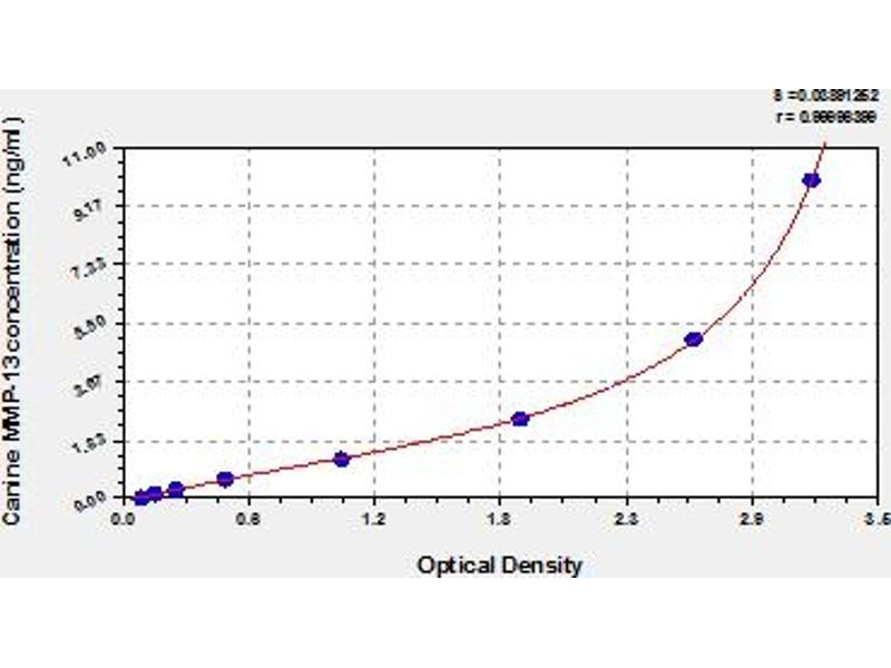 This assay has high sensitivity and excellent specificity for detection of canine MMP-13. No significant cross-reactivity or interference between canine MMP-13 and analogues was observed. Note: Limited by current skills and knowledge, it is impossible for us to complete the cross-reactivity detection between canine MMP-13 and all the analogues, therefore, cross reaction may still exist.