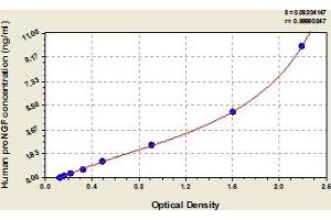 This assay has high sensitivity and excellent specificity for detection of human proNGF. No significant cross-reactivity or interference between human proNGF and analogues was observed. Note: Limited by current skills and knowledge, it is impossible for us to complete the cross-reactivity detection between human proNGF and all the analogues, therefore, cross reaction may still exist.