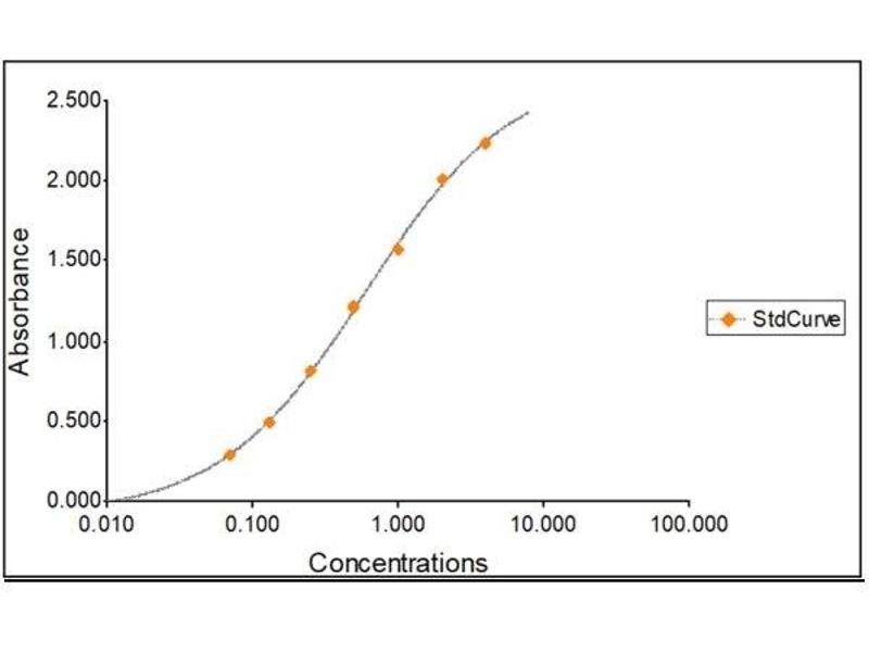 All samples and standards should be assayed in duplicates. 2. The Standards and the test sample(s) should be loaded into the ELISA wells as quickly as possible to avoid a shift in OD readings. Using a multichannel pipette would reduce this occurrence. Pipette 100 μL of Standard 0 (0.0 ng/mL) in duplicate Standard 1 (0.063 ng/mL) in duplicate Standard 2 (0.13 ng/mL) in duplicate Standard 3 (0.25 ng/mL) in duplicate Standard 4 (0.50 ng/mL) in duplicate Standard 5 (1 ng/mL) in duplicate Standard 6 (2 ng/mL) in duplicate Standard 7 (4 ng/mL) in duplicate 3. Pipette 100 μL of sample (in duplicate) into pre designated wells. 4. Incubate the micro titer plate at room temperature for one hundred and 2.5 hours. Keep plate covered and level during incubation. 5. Following incubation, aspirate the contents of the wells. 6. Completely fill each well with appropriately diluted Wash Solution and aspirate. Repeat three times, for a total of four washes. If washing manually: completely fill wells with wash buffer, invert the plate then pour/shake out the contents in a waste container. Follow this by sharply striking the wells on absorbent paper to remove residual buffer. Repeat 3 times for a total of four washes. 7. Pipette 100 μL of appropriately diluted Detection Antibody to each well. Incubate at room temperature for twenty (20 ± 2) minutes. Keep plate covered in the dark and level during incubation. 8. Wash and blot the wells as described in Steps 5/6. 9. Pipette 100 μL of appropriately diluted HRP-streptavidin to each well. Incubate at room temperature for twenty (20 ± 2) minutes. Keep plate covered in the dark and level during incubation. 10. Wash and blot the wells as described in Steps 5/6. 11. Pipette 100 μL of TMB Substrate Solution into each well. 12. Incubate in the dark at room temperature for precisely ten (10) minutes. 13. After ten minutes, add 100 μL of Stop Solution to each well. 14. Determine the absorbance (450 nm) of the contents of each well within 30 minutes. Calibrate the plate reader to manufacturer’s specifications.