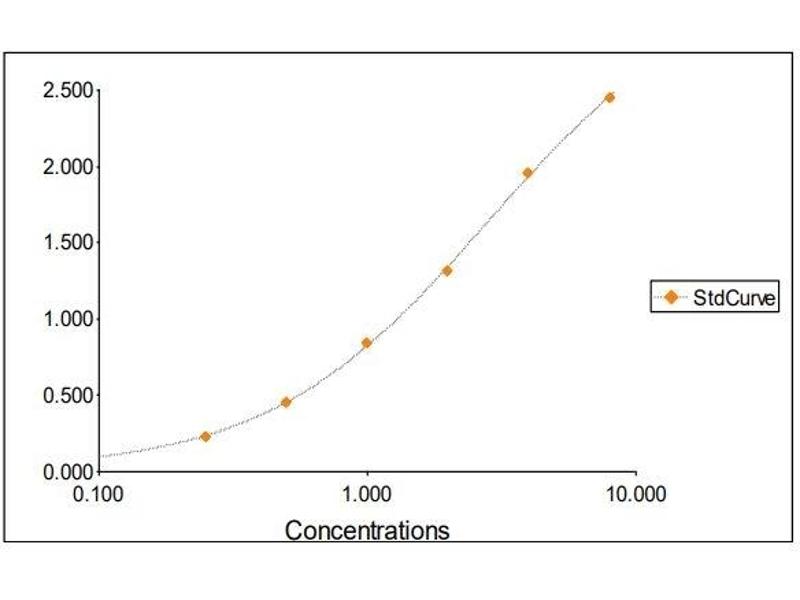 2. The Standards and the test sample(s) should be loaded into the ELISA wells as quickly as possible to avoid a shift in OD readings. Using a multichannel pipette would reduce this occurrence. Pipette 100 μL of Standard 0 (0.0 ng/mL) in duplicate Standard 1 (0.25 ng/mL) in duplicate Standard 2 (0.50 ng/mL) in duplicate Standard 3 (1 ng/mL) in duplicate Standard 4 (2 ng/mL) in duplicate Standard 5 (4 ng/mL) in duplicate Standard 6 (8 ng/mL) in duplicate