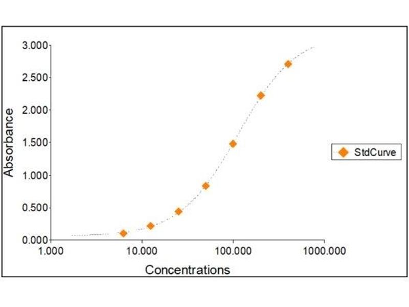 2. The Standards and the test sample(s) should be loaded into the ELISA wells as quickly as possible to avoid a shift in OD readings. Using a multichannel pipette would reduce this occurrence. Pipette 100 μL of Standard 0 (0.0 ng/mL) in duplicate Standard 1 (6.25 ng/mL) in duplicate Standard 2 (12.5 ng/mL) in duplicate Standard 3 (25 ng/mL) in duplicate Standard 4 (50 ng/mL) in duplicate Standard 5 (100 ng/mL) in duplicate Standard 6 (200 ng/mL) in duplicate Standard 7 (400 ng/mL) in duplicate