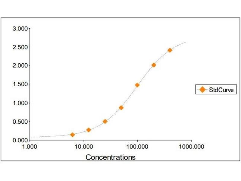 2. The Standards and the test sample(s) should be loaded into the ELISA wells as quickly as possible to avoid a shift in OD readings. Using a multichannel pipette would reduce this occurrence. Pipette 100 μL of Standard 0 (0.0 ng/mL) in duplicate Standard 1 (6.25 ng/mL) in duplicate Standard 2 (12.50 ng/mL) in duplicate Standard 3 (25 ng/mL) in duplicate Standard 4 (50 ng/mL) in duplicate Standard 5 (100 ng/mL) in duplicate Standard 6 (200 ng/mL) in duplicate Standard 7 (400 ng/mL) in duplicate