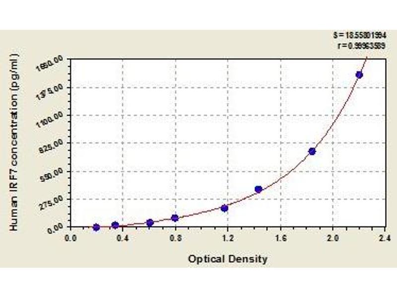 - Antibody specific for IRF7 has been pre-coated onto a microplate. Standards and samples are pipetted into the wells and any IRF7 present is bound by the immobilized antibody. After removing any unbound substances, a biotin-conjugated antibody specific for IRF7 is added to the wells. After washing, avidin conjugated Horseradish Peroxidase (HRP) is added to the wells. Following a wash to remove any unbound avidin-enzyme reagent, a substrate solution is added to the wells and color develops in proportion to the amount of IRF7 bound in the initial step. The color development is stopped and the intensity of the color is measured.
