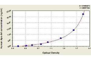 - The microtiter plate provided in this kit has been pre-coated with an antibody specific to Apo-A4 Standards or samples are then added to the appropriate microtiter plate wells with a HRP-conjugated antibody preparation specific for Apo-A4 to each microplate well and incubated. Then a TMB (3,3',5,5' tetramethyl-benzidine) substrate solution is added to each well. Only those wells that contain Apo-A4, HRP-conjugated antibody will exhibit a change in color. The enzyme-substrate reaction is terminated by the addition of a sulphuric acid solution and the color change is measured spectrophotometrically at a wavelength of 450 nm ± 2 nm. The concentration of Apo-A4 in the samples is then determined by comparing the O.D. of the samples to the standard curve.