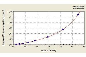 - Antibody specific for CD70 has been pre-coated onto a microplate. Standards and samples are pipetted into the wells and any CD70 present is bound by the immobilized antibody. After removing any unbound substances, a biotin-conjugated antibody specific for CD70 is added to the wells. After washing, avidin conjugated Horseradish Peroxidase (HRP) is added to the wells. Following a wash to remove any unbound avidin-enzyme reagent, a substrate solution is added to the wells and color develops in proportion to the amount of CD70 bound in the initial step. The color development is stopped and the intensity of the color is measured.