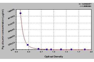 - This assay employs the competitive inhibition enzyme immunoassay technique. The microtiter plate provided in this kit has been pre-coated with pig albumin. Add pig albumin (Standards or samples) to the well, and then add rabbit anti - pig albumin antibody. A competitive inhibition reaction is launched between pig albumin (Standards or samples) and pre-coated with pig albumin with the rabbit anti - pig albumin antibody. Then add Horseradish Peroxidase (HRP)-conjugated -anti- rabbit IgG to each well. The substrate solutions are added to the wells, respectively. And the color develops in opposite to the amount of pig albumin bound in the initial step. The color development is stopped and the intensity of the color is measured.