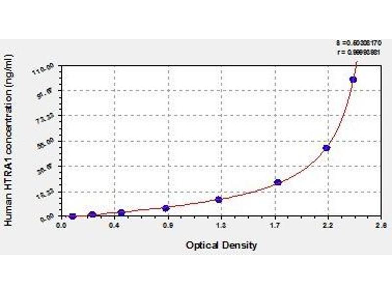 - Antibody specific for HTRA1 has been pre-coated onto a microplate. Standards and samples are pipetted into the wells and any HTRA1 present is bound by the immobilized antibody. After removing any unbound substances, a biotin-conjugated antibody specific for HTRA1 is added to the wells. After washing, avidin conjugated Horseradish Peroxidase (HRP) is added to the wells. Following a wash to remove any unbound avidin-enzyme reagent, a substrate solution is added to the wells and color develops in proportion to the amount of HTRA1 bound in the initial step. The color development is stopped and the intensity of the color is measured.