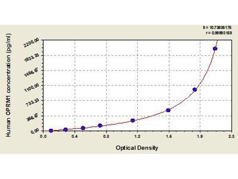 Antibody specific for OPRM1 has been pre-coated onto a microplate. Standards and samples are pipetted into the wells and any OPRM1 present is bound by the immobilized antibody. After removing any unbound substances, a biotin-conjugated antibody specific for OPRM1 is added to the wells. After washing, avidin conjugated Horseradish Peroxidase (HRP) is added to the wells. Following a wash to remove any unbound avidin-enzyme reagent, a substrate solution is added to the wells and color develops in proportion to the amount of OPRM1 bound in the initial step. The color development is stopped and the intensity of the color is measured.