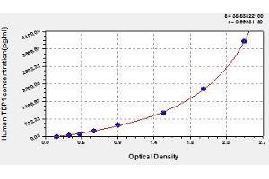 - Antibody specific for TDP1 has been pre-coated onto a microplate. Standards and samples are pipetted into the wells and any TDP1 present is bound by the immobilized antibody. After removing any unbound substances, a biotin-conjugated antibody specific for TDP1 is added to the wells. After washing, avidin conjugated Horseradish Peroxidase (HRP) is added to the wells. Following a wash to remove any unbound avidin-enzyme reagent, a substrate solution is added to the wells and color develops in proportion to the amount of TDP1 bound in the initial step. The color development is stopped and the intensity of the color is measured.