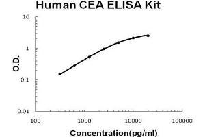 - human CEA ELISA Kit was based on standard sandwich enzyme-linked immune-sorbent assay technology. A monoclonal antibody from mouse specific for CEA has been precoated onto 96-well plates. Standards(NSO, K35-A685) and test samples are added to the wells, a biotinylated detection polyclonal antibody from goat specific for CEA is added subsequently and then followed by washing with PBS or TBS buffer. Avidin-Biotin-Peroxidase Complex was added and unbound conjugates were washed away with PBS or TBS buffer. HRP substrate TMB was used to visualize HRP enzymatic reaction. TMB was catalyzed by HRP to produce a blue color product that changed into yellow after adding acidic stop solution. The density of yellow is proportional to the human CEA amount of sample captured in plate.