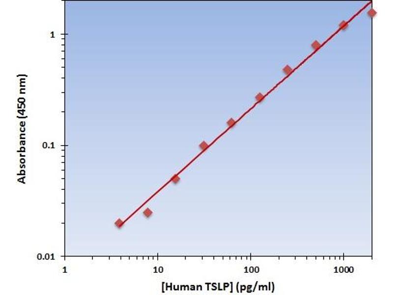 - The OmniKine? Human TSLP ELISA Kit contains the components necessary for quantitative determination of natural or recombinant Human TSLP concentrations within any experimental sample including cell lysates, serum and plasma. This particular immunoassay utilizes the quantitative technique of a "Sandwich" Enzyme-Linked Immunosorbent Assay (ELISA) where the target protein (antigen) is bound in a "sandwich" format by the primary capture antibodies coated to each well-bottom and the secondary detection antibodies added subsequently by the investigator. The capture antibodies coated to the bottom of each well are specific for a particular epitope on Human TSLP while the user-added detection antibodies bind to epitopes on the captured target protein. Amid each step of the procedure, a series of wash steps must be performed to ensure the elimination of non- specific binding between proteins to other proteins or to the solid phase. After incubation and "sandwiching" of the target antigen, a peroxidase enzyme is conjugated to the constant heavy chain of the secondary antibody (either covalently or via Avidin/Streptavidin-Biotin interactions), allowing for a colorimetric reaction to ensue upon substrate addition. When the substrate TMB (3, 3', 5, 5'-Tetramethylbenzidine) is added, the reaction catalyzed by peroxidase yields a blue color that is representative of the antigen concentration. Upon sufficient color development, the reaction can be terminated through addition of Stop Solution (2 N Sulfuric Acid) where the color of the solution will turn yellow. The absorbance of each well can then be read by a spectrophotometer, allowing for generation of a standard curve and subsequent determination of protein concentration.