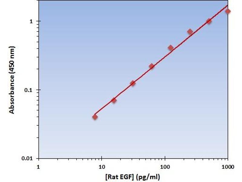 - The OmniKine? Rat EGF ELISA Kit contains the components necessary for quantitative determination of natural or recombinant Rat EGF concentrations within any experimental sample including cell lysates, serum and plasma. This particular immunoassay utilizes the quantitative technique of a "Sandwich" Enzyme-Linked Immunosorbent Assay (ELISA) where the target protein (antigen) is bound in a "sandwich" format by the primary capture antibodies coated to each well-bottom and the secondary detection antibodies added subsequently by the investigator. The capture antibodies coated to the bottom of each well are specific for a particular epitope on Rat EGF while the user-added detection antibodies bind to epitopes on the captured target protein. Amid each step of the procedure, a series of wash steps must be performed to ensure the elimination of non- specific binding between proteins to other proteins or to the solid phase. After incubation and "sandwiching" of the target antigen, a peroxidase enzyme is conjugated to the constant heavy chain of the secondary antibody (either covalently or via Avidin/Streptavidin-Biotin interactions), allowing for a colorimetric reaction to ensue upon substrate addition. When the substrate TMB (3, 3', 5, 5'-Tetramethylbenzidine) is added, the reaction catalyzed by peroxidase yields a blue color that is representative of the antigen concentration. Upon sufficient color development, the reaction can be terminated through addition of Stop Solution (2 N Sulfuric Acid) where the color of the solution will turn yellow. The absorbance of each well can then be read by a spectrophotometer, allowing for generation of a standard curve and subsequent determination of protein concentration.