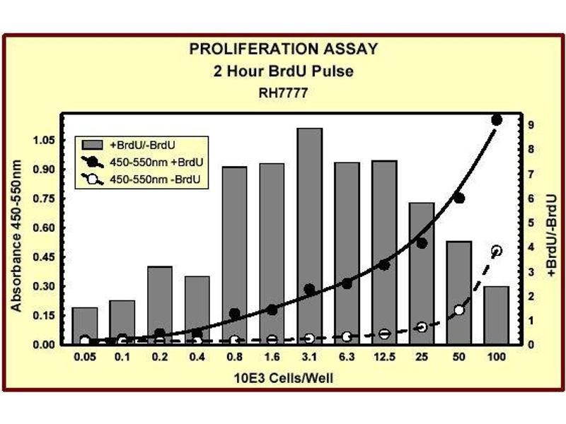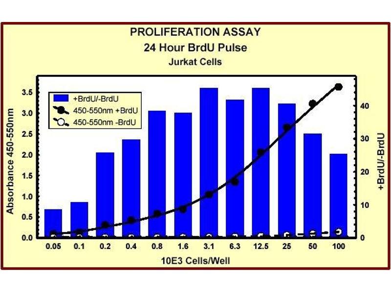 The BrdU Cell Proliferation ELISA involves incorporation of BrdU into cells cultured in microtiter plates using the cell layer as the solid phase. The resultant assay is sensitive, rapid, easy to perform and applicable to high sample throughput. In addition to evaluation of cell proliferation, information such as cell number, morphology and analysis of cellular antigens can be obtained from a single culture.The BrdU Cell Proliferation ELISA involves incorporation of BrdU into cells cultured in microtiter plates using the cell layer as the solid phase. During the final 2 to 24 hours of culture BrdU is added to wells of the microtiter plate. BrdU will be incorporated into the DNA of dividing cells. To enable antibody binding to the incorporated BrdU cells must be fixed, permeabilized and the DNA denatured. This is all done in one step by treatment with Fixing Solution. BrdU Antibody is pipetted into the wells and allowed to incubate for one hour, during which time it binds to any incorporated BrdU. Unbound antibody is washed away and horseradish peroxidase (HRP)-conjugated goat anti-mouse antibody is added, which binds to the BrdU Antibody. The HRP catalyzes the conversion of the chromogenic substrate tetramethylbenzidine (TMB) from a colorless solution to a blue solution (or yellow after the addition of stopping reagent), the intensity of which is proportional to the amount of incorporated BrdU in the cells. The colored reaction product is quantified using a spectrophotometer.
