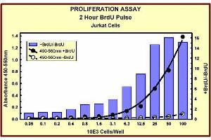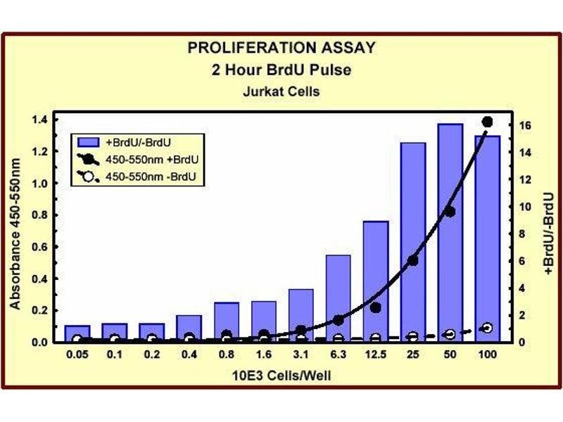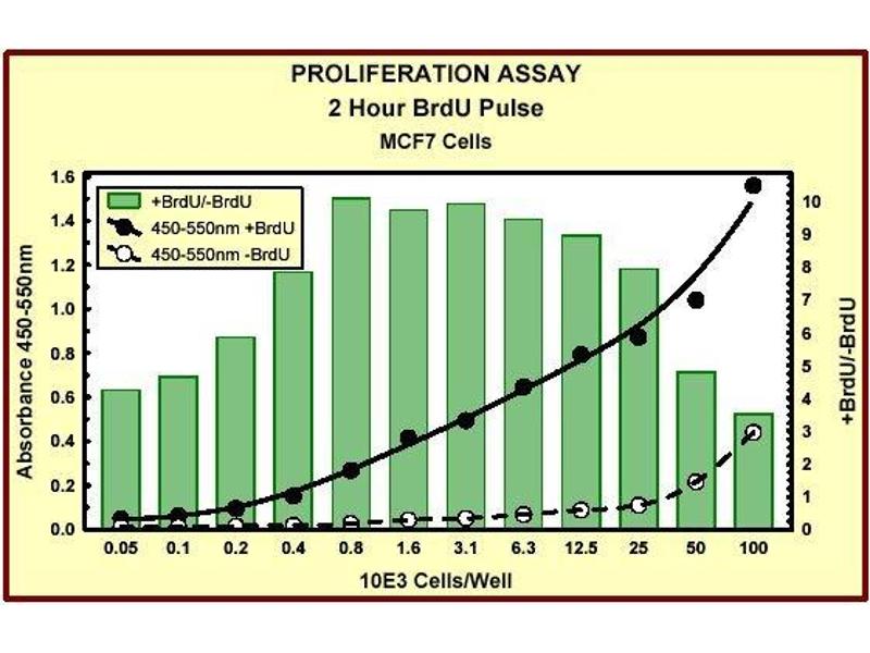Evaluation of cell cycle progression is essential for investigations in many scientific fields. Measurement of [ 3 H]-thymidine incorporation as cells enter S phase has long been the traditional method for the detection of cell proliferation. Subsequent quantification of [ 3 H]-thymidine is performed by scintillation counting or autoradiography. This technology is slow, labor intensive and has several limitations including the handling and disposal of radioisotopes and the necessity of expensive equipment. In an alternative method to [ 3 H]-thymidine uptake, the thymidine analog BrdU is used in place of [ 3 H]-thymidine and is incorporated into newly synthesized DNA strands of actively proliferating cells. Following partial denaturation of double stranded DNA, BrdU is detected immunochemically allowing the assessment of the population of cells, which are actively synthesizing DNA.