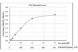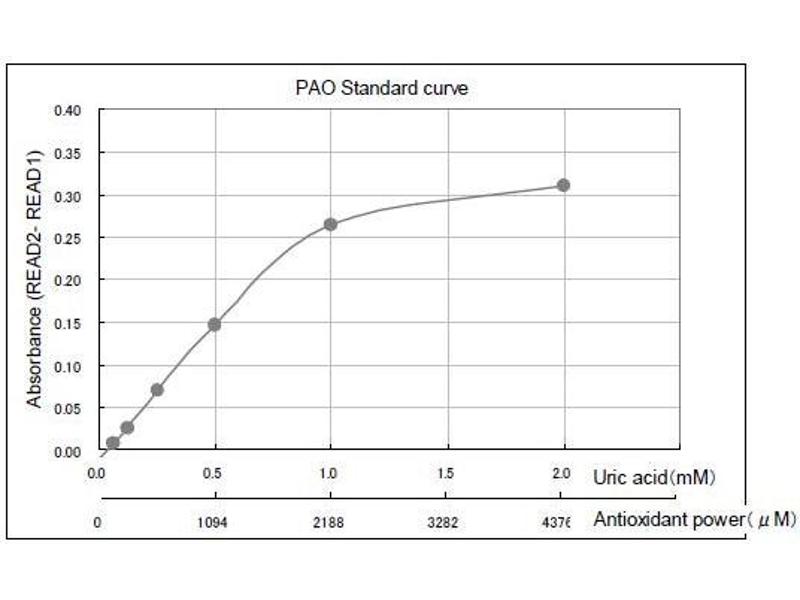 - Oxidative stress plays an important role in various diseases and aging. The control of oxidative stress is expected to be useful to prevent diseases and aging. Oxidative stress is caused by the imbalance between reactive oxygen species (ROS) and antioxidant defense system. For accurate assessment of oxidative stress, measurement of ROS, oxidative damage and antioxidant activity may be essential. PAO can detect not only hydrophilic antioxidants such as Vitamin C and glutathione, but can also detect hydrophobic antioxidants such as Vitamin E. Applicable for the assessment of total antioxidants of serum, foods, and beverage samples. For research use only.Samples are mixed with Cu++ Solution. Cu++ are reduced by antioxidants to form Cu+. Reduced Cu+ react with Chromatic Solution (Bathocuproine), and can be detected by absorbance at wavelength 480 to 490 nm. Antioxidant capacity can be calculated from the Cu+ formed.