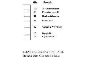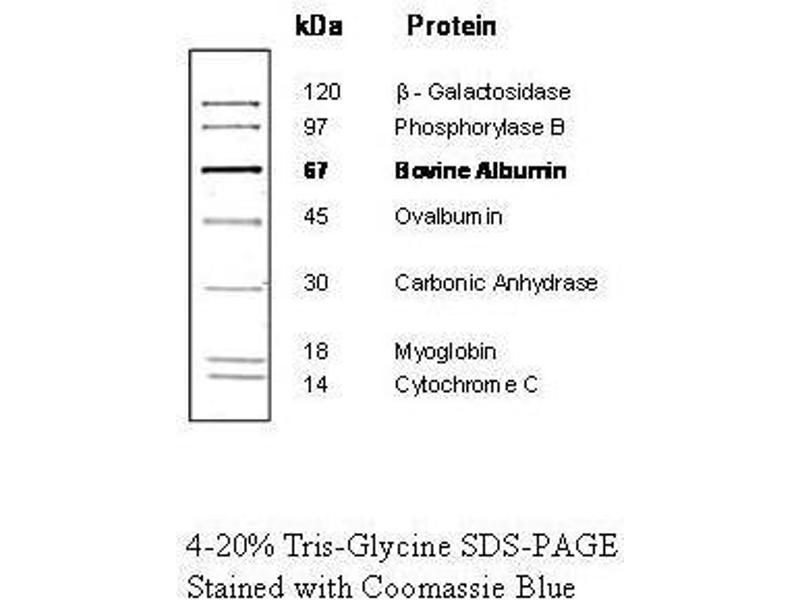 - The protein mixture has been formulated to yield well-defined bands after SDS-polyacrylamide gel electrophoresis and staining with Coomassie blue or other common staining techniques. The intensity of the 67 kDa bovine albumin band has been increased to serve as a reference. The product is supplied in 1X loading buffer and is ready-to-use.