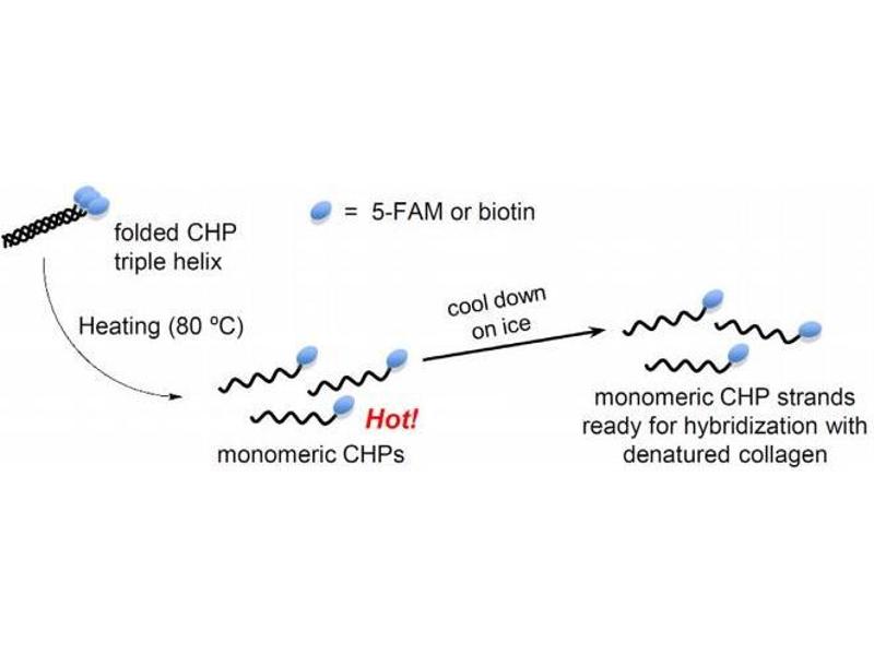 The Collagen Hybridizing Peptide (CHP) is a synthetic peptide that can specifically bind to such denatured collagen strands through hydrogen bonding, both in histology, in vivo, and in vitro (3D cell culture). By sharing the structural motif and the Gly-X-Y repeating sequence of natural collagen, CHP has a strong capability to hybridize with denatured collagen strands, in a fashion that is similar to a DNA fragment annealing to its complimentary DNA strand during PCR. CHP is an extremely specific probe for unfolded collagen molecules: it has negligible affinity to intact collagen molecules due to the lack of binding sites, it is also inert towards non-specific binding because of its neutral and hydrophilic nature.