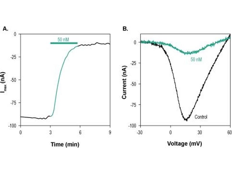 SNX-230,ω-Conotoxin MVIIC blocks CaV2.1 (α1A, P/Q-type) and CaV2.2 (α1B, N-type) channels.1 The toxin binds with high affinity to CaV2.1 and with lower affinity to CaV2.2 in rabbit brain.2 However, the block by ω-Conotoxin-MVIIC of N-type channels in DRG neurons developed much faster than the block of P-type currents in Purkinje cells.1 The effect of the toxin is modulated by voltage (i.e. it is more potent for inactivated channels).3In addition this toxin was reported to block nicotinic receptors (transiently expressed in Xenopus oocytes) with IC50 of 1.3 μM4 It was also shown to inhibit K+-induced 3H-GABA release in hippocampus in vivo.5 This effect was with high affinity (50 % block, 200 nM). The toxin was used to inhibit synaptic transmission in several peripheral preparations.6,7