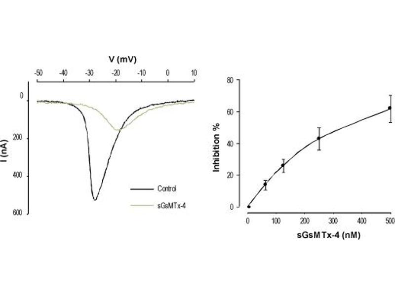 M-TRTx-Gr1a, M-theraphotoxin-Gr1a, GsMTx4,GsMTx-4 is a 34 amino acid peptidyl toxin originally isolated from the Grammostola rosea (Chilean rose) tarantula venom and belongs to the huwentoxin-1 family1.This toxin inhibits different channels and in addition has antimicrobial activity. It blocks cation-selective mechanosensitive ion channels (strech-activated channels, SACs), without having an effect on whole-cell voltage-sensitive currents1. In addition, it inhibits atrial fibrillation2 as well as the membrane motor of outer hair cells3 at low doses. A medium toxicity on a large spectra of voltage-gated Na+ channels, namely NaV1.1, NaV1.2, NaV1.3, NaV1.4, NaV1.5, NaV1.6 and NaV1.7 was reported. GsMTx-4 also inhibits K+ channels KV11.1 and KV11.2, whereas it does not inhibit K+ channels KV1.1 (IC50 > 85 μM), KV1.4 (IC50 > 85 μM) and KV11.3 (IC50 = 53 μM)4. GsMTx-4 was also found to inhibit both TRPC1 and TRPC6 channels5,6, as well as Piezo1, the mechanosensitive channel7.Antimicrobial activity is shown against several Gram-positive and Gram-negative bacteria as well8.