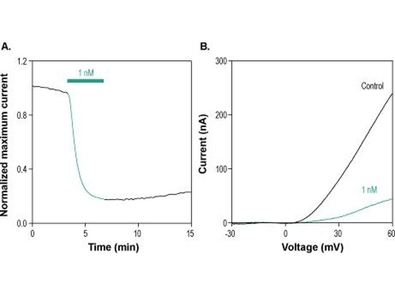 K+ channel toxin ShK, Toxin κ-stichotoxin-She3a, Kappa-stichotoxin-She3a, κ-SHTX-She3a,ShK (Stichodactyla Toxin) is a peptidyl toxin originally isolated from the nematocyst of the sea anemone Stichodactyla helianthus.1ShK blocks KV1.3, KV1.1, KV1.4, and KV1.6 at subnanomolar concentrations and KV3.2 channels at 1000-fold higher concentration than that required to inhibit KV1.3 channels. It has been shown to block KV current in DRG neurons, to displace radioactive Dendrotoxin from brain synaptosomes1 and inhibit I125-Charybdotoxin binding to Jurkat T lymphocytes with an IC50 of 32 pM2,4Evidence also suggests that native KV currents in the central nervous system, which are predominantly carried by KV1.2 channels, are highly sensitive to this toxin.5A fluorescently labeled synthetic ShK is used to recognize and to sort KV1.3 containing lymphocytes.4,6
