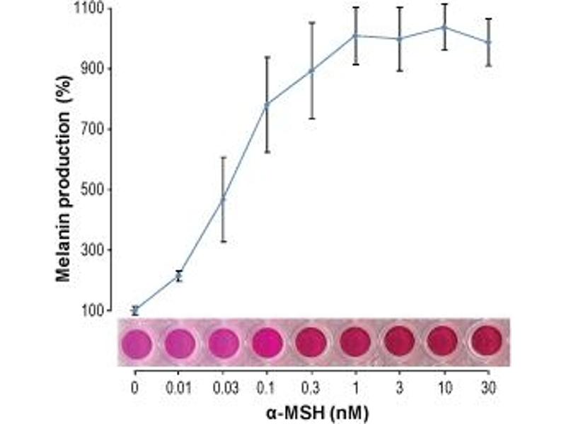 α-Melanotropin, alpha-MSH,α-MSH is a neuropeptide originally isolated from the pituitary gland1. α-MSH is produced by post-translational processing of a precursor protein, proopiomelanocortin (POMC)2. In most vertebrates but not in mammals, α-MSH is produced in the intermediate lobe of the pituitary gland. The biological activities of α-MSH are mediated through a family of five specific G-protein coupled receptors: MCR1, MCR2, MCR3, MCR4, and MCR5. α-MSH is an evolutionarily highly conserved peptide action that induces pigment dispersion in skin melanocytes of amphibians, reptiles and mammals by stimulating melanin production3,4.However, in human and other mammals, α-MSH acts in the brain in appetite suppression and sexual arousal. Some cases of extreme obesity have been traced to mutated α-MSH receptor in the brain. Presumably, these people are unable to respond to the appetite-suppressing effect of α-MSH5. α-MSH has significant anti-inflammatory properties, mediated through its binding to MCR16 and includes regulation of expression and secretion of chemokines, downregulation of proinflammatory signal-induced NF-kB activation and adhesion molecule expression, prostaglandin E2 synthesis, as well as induction of interleukin-107.