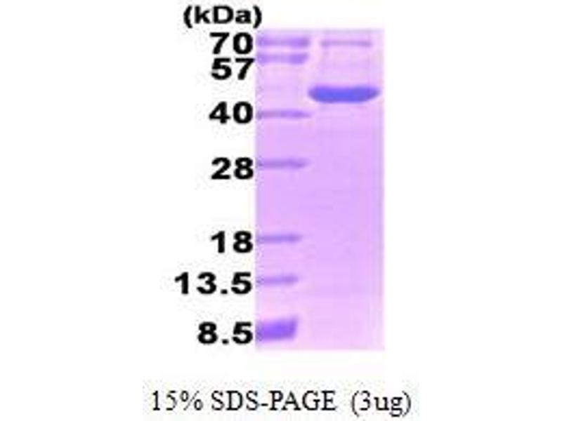 OAT, also known as mitochondrial enzyme ornithine aminotransferase, is a key enzyme in the pathway that converts arginine and ornithine into the major excitatory and inhibitory neurotransmitters glutamate and GABA. Mutations that result in a deficiency of this enzyme cause the autosomal recessive eye disease Gyrate Atrophy. Recombinant OAT protein was expressed in E. coli and purified by using conventional chromatography techniques. Alternative Names: OATASE protein, HOGA protein, Ornithine aminotransferase protein, Ornithine--oxo-acid aminotransferase., mitochondrial precursor protein, DKFZp781A11155 protein, ornithine aminotransferase precursor protein, ornithine aminotransferase (gyrate atrophy) protein, ornithine aminotransferase precursor EC 2.6.1.13 protein, Ornithine oxo-acid aminotransferase protein