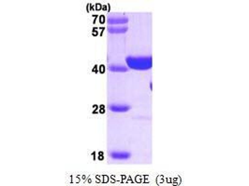 PARP1 is a nuclear DNA-binding zinc finger protein which can exist as a homo- or hetero-dimer, and is strongly activated by DNA strand breaks. This protein involved in chromatin architecture and DNA metabolism, and participates in protein modification to enhance or repress transcription. PARP1 also plays a role in other cellular processes, including cell proliferation and differentiation. PARP-1 deficiencies lead to chromosomal instability due to higher frequencies of chromosome fusions and aneuploidy, suggesting that poly(ADPribosyl)ation contributes to the efficient maintenance of genome integrity. Recombinant PARP1 protein was expressed in E. coli and purified by using conventional chromatography techniques. Alternative Names: PARP1 protein, Poly (ADP-ribose) polymerase family protein, NAD(+) ADP ribosyltransferase 1 protein, member 1 ADP ribosyltransferase (NAD+ protein, pADPRT-1 protein, sPARP1., PARP-1 protein, PPOL protein, Poly[ADP ribose] synthetase 1 protein, ADPRT1 protein, poly(ADP ribose) synthetase protein, Poly (ADP ribose) polymerase 1 protein, poly(ADP ribosyl)transferase protein, ADPRT 1 protein, PARP 1 protein, ADPRT protein, poly (ADP ribose) polymerase) protein, PARP 1, PARP1, sPARP 1 protein, msPARP protein, pADPRT protein, PARP protein, pADPRT 1 protein, PARP 1 protein, PARP-1, PARP-1 protein