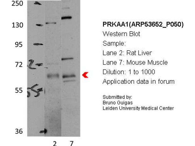 PRKAA1 Reactivité: Humain, Souris, Rat, Chien, Lapin, Boeuf (Vache), Cheval, Cobaye, Poisson zèbre (Danio rerio), Mouton WB Hôte: Lapin Polyclonal unconjugated