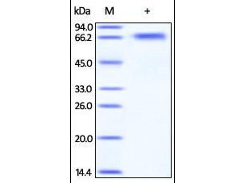 - This protein carries no "tag". The protein has a calculated MW of 49 kDa. The protein migrates as 60-70 kDa under reducing (R) condition (SDS-PAGE) due to glycosylation.