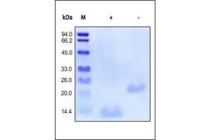 - This protein carries no "tag". The protein has a calculated MW of 13 kDa. the protein migrates as 13 kDa under reducing (R) condition, and 24 kDa under non-reducing (NR) condition (SDS-PAGE).