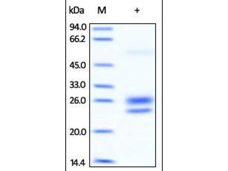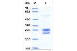 - This protein carries no "tag". The protein has a calculated MW of 17 kDa. The protein migrates as 24 kDa and 26 kDa under reducing (R) condition (SDS-PAGE) due to different glycosylation.
